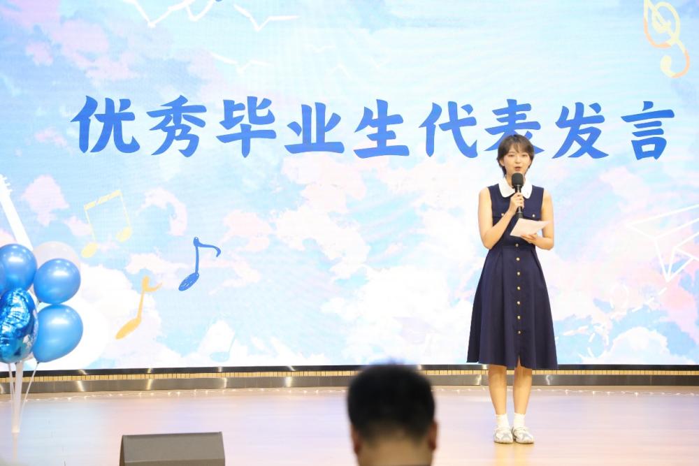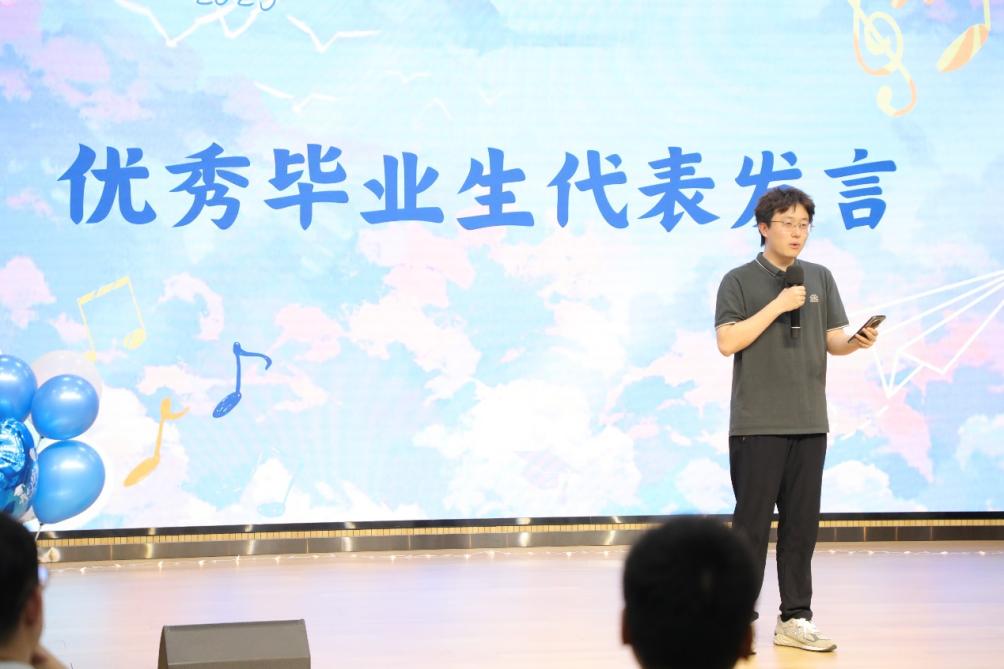 学院2021级本科生刘斯婕作为本科毕业生代表发言。她回顾了过去四年来的成长经历,坦言在迷茫与挫折中正是师长的引导与同辈的鼓励让自己变得更加坚韧勇敢。她感谢学院给予的支持与陪伴,也表示将带着四年收获的智慧与情谊,走向更远的未来。